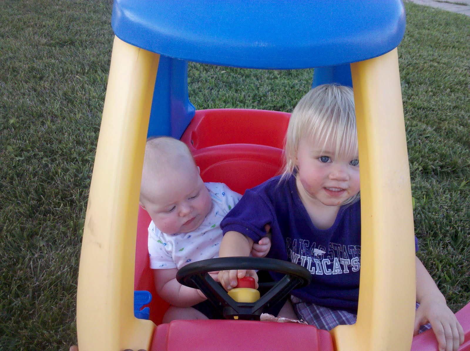 When she gave it to us I showed it to Saffryn. I told her she and Pierce could ride in it together. She got SO excited and started happily screaming "Pierce together. Pierce together!!!!" It was so sweet. But what is even sweeter is seeing these two cuties actually riding together!